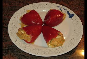 Una vez que se han enfriado los huevos los troceáis y se los añadís a la mezcla. Luego echáis un par de cucharadas soperas de tomate y otras dos de mayonesa y ya está listo el relleno. Ahora sólo falta coger una cucharilla pequeña y poco a poco ir rellenado los pimientos intentando que no se rompan y ya están listos para comer.
