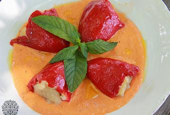 Preparamos la salsa, sofriendo la cebolla y el ajo troceados. Añadimos los pimientos picados y las almendras. Dejamos pochar unos tres minutos y ponemos la nata, sal y pimienta. Cuando haya reducido un poco (unos dos minutos), lo trituramos bien.Ya sólo queda emplatar, poniendo un poco de salsa al fondo y colocando los pimientos rellenos encima, que pintaremos con aceite para que queden más brillantes. No tengo que decir que la salsa que quede la ponéis en una salsera aparte, porque si sois como yo, vais a mojetear de lo lindo. ¡QUE APROVECHE!!