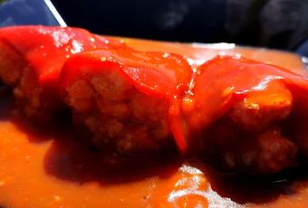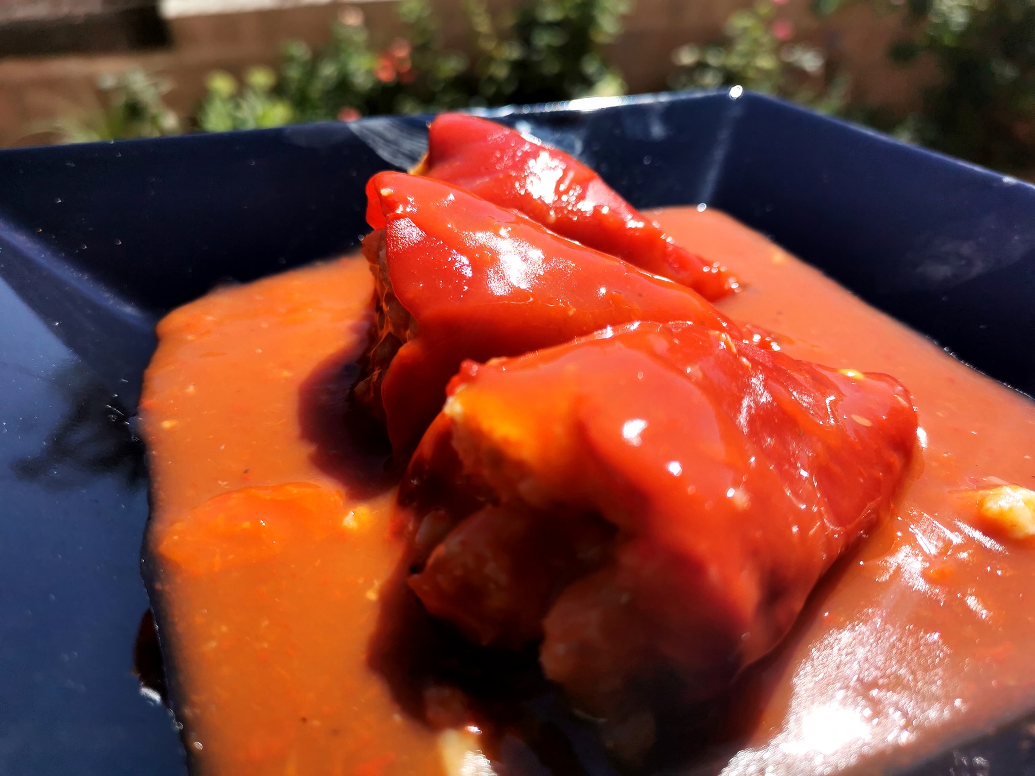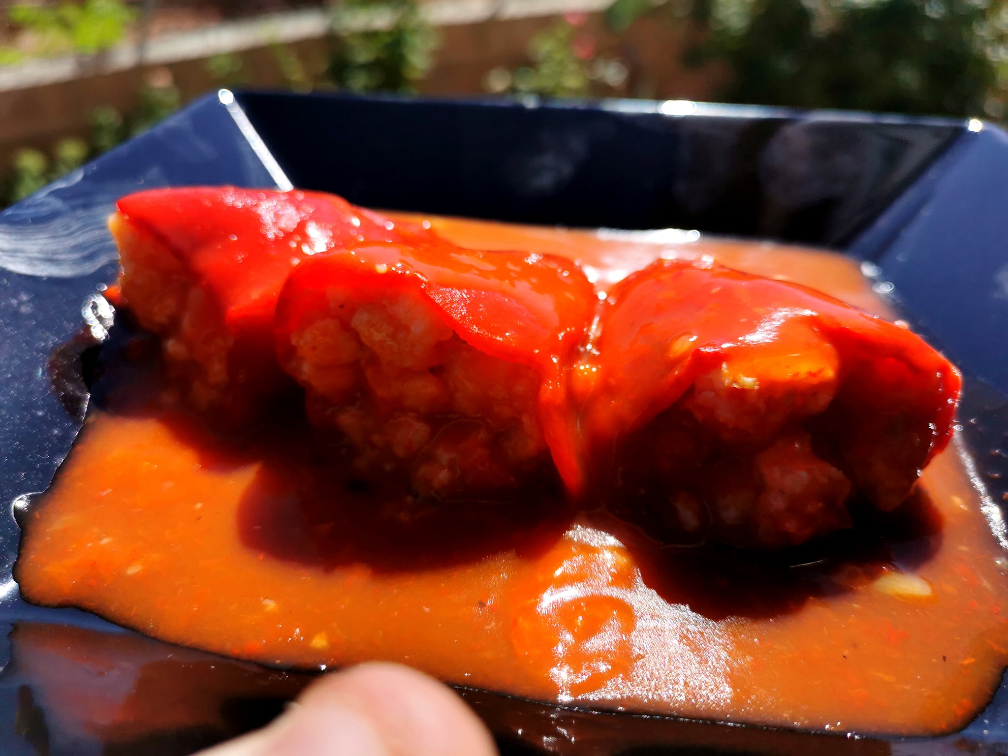 Sacamos los demás pimientos y vamos rellenándolos con la masa de la merluza que teníamos enfriando, podemos rellenarlas con una cuchara y los vamos colocando en una bandeja de cristal con fondo, una vez todos rellenos, cogemos la salsa que tenemos al fuego y la pasamos por la batidora hasta obtener una salsita fina que echamos encima de los pimientos, ya tenemos preparados nuestros pimientos rellenos, les podemos dar un toque de horno y listo para comer, espero que os guste.
