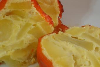 -Pelamos, cortamos y laminamos las patatas, las lavamos y ponemos en una fuente apta para microondas y sasonamos.-En un vaso hacemos una mezcla de 30 g de aceite y 30 de agua y mezclamos bien regando con esta mezcla las patatas. -Tapamos con un film transparente y con un tenedor le hacemos varios agujeros al film e introducimos en el microondas a potencia máxima 20 minutos.3-Mientras batimos los huevos y una vez transcurrido el tiempo sacamos las patatas y se la añadimos a los huevos ya batidos mezclando bien todo el conjunto.1-2-4-Lavamos y cortamos la parte superior a los pimientos extrayéndole toda la semilla y dejándolos huecos.ponemos en una fuente en posición vertical y rellenamos con la mezcla de patatas y huevo y tapamos con papel de aluminio.Precalentamos el horno a 200º y metemos durante 30 ó 35 minutos.Y una vez finalizado el tiempo, le quitamos la lamina de aluminio de la superficie y pelamos el pimiento y colocamos sobre el plato y servimos.