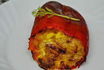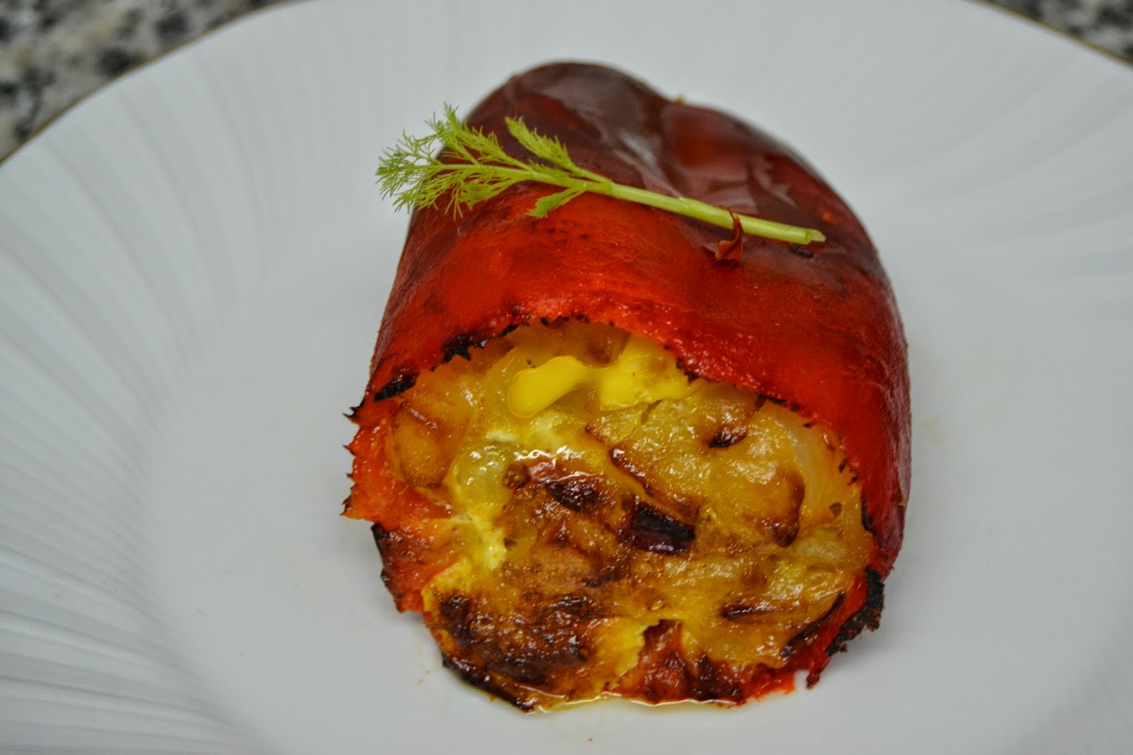 Hace ya muchísimo tiempo que veo recetas de pimientos rellenos de tortilla por Internet aunque la primera vez que lo vi fue en Cantabria en un bar de montaditos, pero nunca se me a ocurrido hasta hoy en prepararlos. He de decir que cinco minutos más en el horno hubiera sido perfecto, porque le falto un poquito y no pude quitar toda la piel bien, pero la próxima no me pasa, de todas formas os explico como lo hice, para que lo hagáis si es que aún no lo habéis hecho nunca, la verdad es que estan muy ricos.Ingredientes:2 pimientos rojos2 patatas2 huevos1 cebollaAceite de olivaSalPreparación:Lavamos los pimientos y los cortamos por arriba como si fuera una tapa.Freímos la patata y la cebolla con sal como para hacer la tortilla,añadimos la parte del pimiento que le hemos cortado la tapa y lo hacemos a trocitos y lo freímos cuando ya este listo, batimos los huevos y mezclamos con la patata, hasta ahí es como una tortilla de patatas tradicional si, pero ahora vamos a rellenar los pimientos con la mezcla.