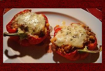 Sacar los pimientos del horno y rellenarlos con el refrito. Echar el queso rallado por encima y rociarlo de aceite. Espolvoreamos también con orégano y pimienta molida si se desea. Finamente introducir el conjunto en el horno, aunque esta vez al grill y gratinar al gusto.