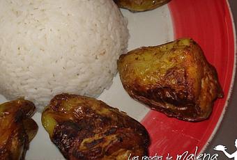 Primero colocáis los pimientos todos juntos en la sartén boca para abajo durante un minuto y después ya los podéis freir normalmente. Los ponéis en una fuente redonda con un flan de arroz blanco en el centro.