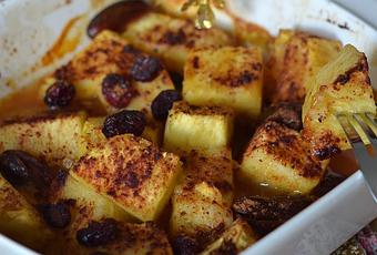 Ingredientes: 4 personas1/2 piña natural8 dátiles1 puñado de arándanos secosel zumo de 1 naranja60 ml de ron4 cucharadas soperas de mielcanela molida nuez moscada molida