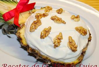 - Cortamos la piña por la mitad (si queremos hacer las dos mitades solo hay que poner el doble de ingredientes…J). Sacamos la carne de la piña y la troceamos en dados. - Partimos las nueces, reservamos unos trozos para decorar, el resto las troceamos. - Ponemos la nata muy fría en un bol la montamos mezclándola con el azúcar, reservamos unas cucharadas para decorar. - Mezclamos en un bol la piña con las nueces y la nata, lo ponemos en la piña, cubrimos con la nata que teníamos reservada y decoramos con las nueces.