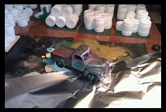 Este es el modelo que Morguez pretendía copiar: una vieja ranchera Chevrolet de la marca Maisto, que ya había envejecido para nuestra campaña de zombis. Al lado tenemos una lámina de papel de plata, suficiente como para envolver el coche.