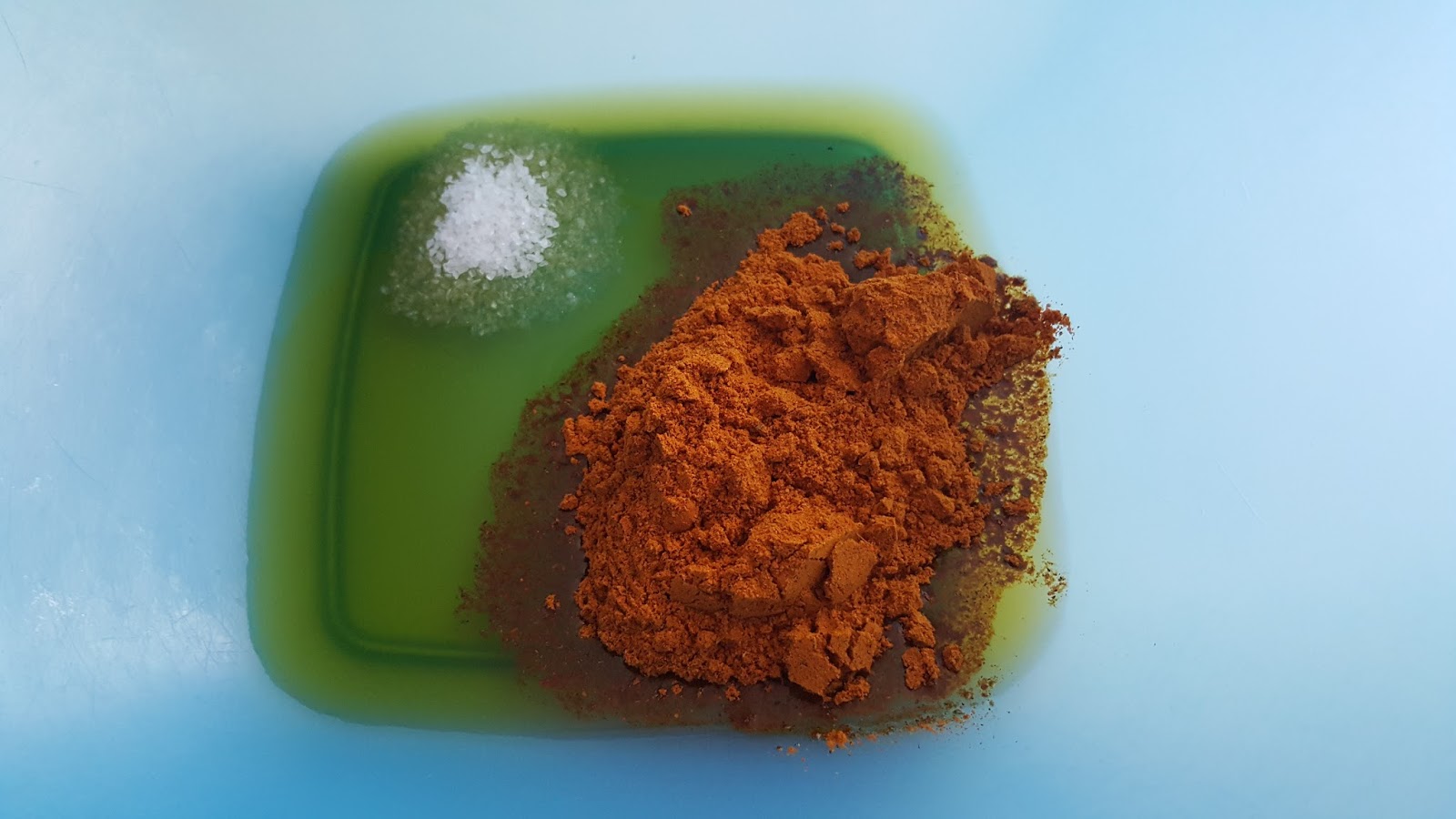2. - En un bol pondremos las especias junto con el aceite y la sal y lo mezclamos bien.