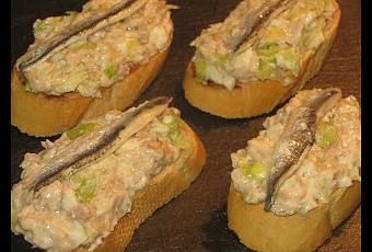 Ingredientes:- 4 cucharadas de mayonesa.- 2 latas de atún.- 4 rebanadas de pan.- 1 huevo cocido.- ¼ de lechuga.- Boquerones en vinagre para decorar.