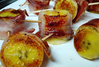Preparación:1º Pelar los plátanos y cortarlos en 5 trozos. 2º Cocer las cortadas de beicon enuna sartén, hasta que se quede a medio hacer. Sacarlas y enrolla una loncha debeiconen cada trozo deplátano, sujetar con un palillo. 3º En la misma sartén poner los pinchos y con un poco deaceite terminar de freír.