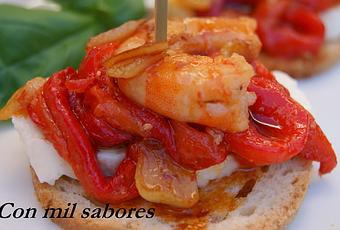 Que si, que si, lo reconozco, tengo adicción a las tapas. Me encantan!!!. Tienen la porción justa para poder probar un montón de cosas diferentes. Y esos carteles en las paredes de los bares con la interminable lista de delicias, que belleza, ni la Gioconda en el Louvre. Y es que cuando vas por la mitad ya no te acuerdas de las primeras.Vamos ,que te pueden repetir una tapa tres veces y no te darías ni cuenta!!!Como ya tenemos el verano encima serán muchas las ocasiones en las que nos reuniremos con los amigos alrededor de una buena mesa, así que casi todas las semanas os presentaré algunas de mis propuestas culinarias para estos deliciosos encuentros.Ingredientes:Pimientos asados cortados en tiras(sin aliñar).Unos langostinos crudos grandes.Rodajas de queso Mozzarella.Unas rodajas de pan (para tostar).Unos dientes de ajo laminados.Aceite de oliva virgen extra.Sal y pimienta.