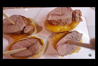 4.- Cortamos las barras de pan en rebanadas de 1 cm. Servimos sobre cada rebanada una cuchara de chutney de mango. Calentamos 4 minutos en el horno el solomillo y lo cortamos en trozos de 1 cm. ponemos sobre cada rebanada un trozo de solomillo. Lo pinchamos con una brocheta y servimos caliente.