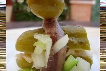 Cuando estén colocados todos los pinchos en el plato ó fuente, regar con la vinagreta hecha con el pimiento y la cebolla muy muy picados.