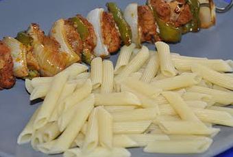 Y ya al día siguiente, con los dedos vamos cogiendo tacos y los vamos ensartando en pinchos de madera de los que venden para brochetas o bien de aluminio, intercalando el pimiento y la cebolla cortados en trozos.Hornear a 200º hasta que estén tostaditos, eso a gustos del consumidor.