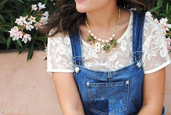 Hello!! The summer holidays are nearly over, at least for me, therefore I'm going to enjoy these last few days as much as I can!! In today's post I'm wearing one of the items that was really trendy last year and still is (although not so much) this year: the denim dungaree. I had already shown you an outfit with it last year here and since they're still in fashion, I decided to wear my denim dungaree again this summer. This time I wore it with my lace crop top, which you already saw here, a green bag and two of my most recent purchases from the sales: the shoes and the pineapple necklace ;)Do you like this trend?¡Buenos días! Ya estoy de vuelta en Alicante!! Las vacaciones de verano están llegando a su fin, al menos para mí, así que voy a disfrutar todo lo que pueda de los días que quedan!! Este es el último look que tengo en Alicante, los próximos que os enseñe ya serán en los sitios en los que he estado de viaje este verano. La tendencia de los petos llegó con mucha fuerza el año pasado y este año también se siguen llevando mucho tanto en su versión larga como corta, así que yo aproveché para volver a sacar el mío del armario (ya os enseñé un look con él aquí). En esta ocasión lo combiné con mi crop top de encaje, que os había enseñado aquí la semana pasada, un bolso verde y dos de mis compras de rebajas: las bailarinas y el collar de piñas ;)¿Te animas con la tendencia de los petos?