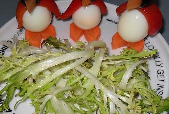 Ahora sólo tenemos que coger unos palillos y primero pinchar la cabeza (la aceituna con el pico de zanahoria), después pincharemos las tiras de pimiento (la bufanda), el huevo de codorniz (el cuerpo) y finalmente la rodaja de zanahoria al que le hemos cortado la mini porción (las patas).