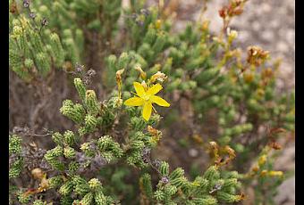 El pinillo de oro (hypericum ericoides) es una planta pequeña que está muy raminifcada y cuya corteza es delgada y quebradiza. En la parte superior de la planta nacen ramas cubiertas de hojitas muy pequeñas que crecen muy juntas. En la punta de estas ramas crece una flor de color amarillo intenso acompañada por flores mas pequeñas. Florece en verano.