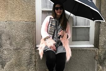 Los complementos, maxi bolso en plateado y paraguas con forma de gatito hacen un look romántico y perfecto para un lluvioso día de invierno.