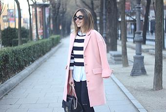 I love pink coats, and today I show you one that I think that has a very nice cut and I especially like the detail of the gold buttons. I combined it with a striped sweater, a pair of black jeans and for accessories I also chose the black color.