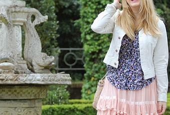 Hoy os traigo un outfit con un toque romántico pero también muy desenfadado. La verdad es que esta falda me encanta, su color, su caída, esos volantes... y ahora que llega la primavera no podía tardar en volver a lucirla. En esta ocasión la combiné con tonalidades azules y le quite romanticismo con la chaqueta vaquera. ¿Qué os parece?