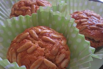 4. - Al día siguiente, precalentar el horno a 180º. Hacer bolitas del tamaño de una nuez y vamos colocando en la bandeja del horno. Decoramos con los piñones y pintamos con la yema de huevo.