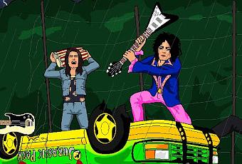 Por favor píntame la escena del ataque del T-Rex de Jurassic Park, pero que el T-Rex sea la banda T-Rex.