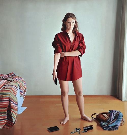 El pintor realista Josep Santilari encuentra los símbolos de las emociones en los elementos de lo cotidiano. «En el cuadro, ella se acaba de levantar de la cama y está todo: el bolso, las llaves, la funda de las gafas, el cuaderno… todo menos él», afirma. «Una vez vino un elegante matrimonio a que los pintara y la mujer llevaba puesta la camisa de su marido. Pensé en todo lo que transmite uno con lo que se pone, en la importancia de la ropa y en lo que expresan los colores que llevamos. La camisa roja del cuadro es de Armand Basi y me encanta su textura. Me la pongo cuando tengo que ir a negociar con mi marchante». Josep expondrá en la próxima Feria de Dibujo de París.