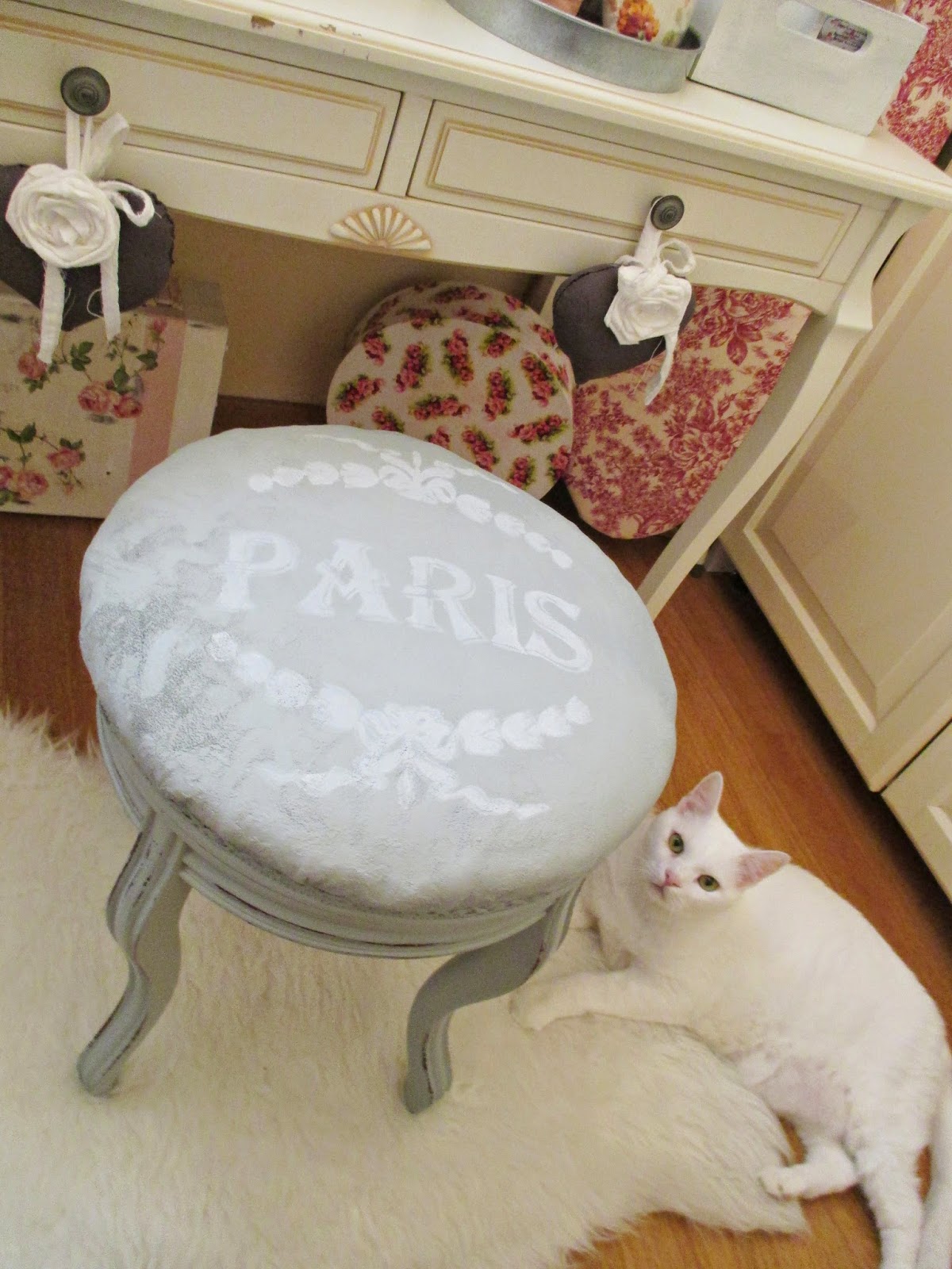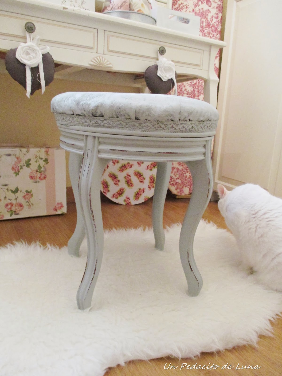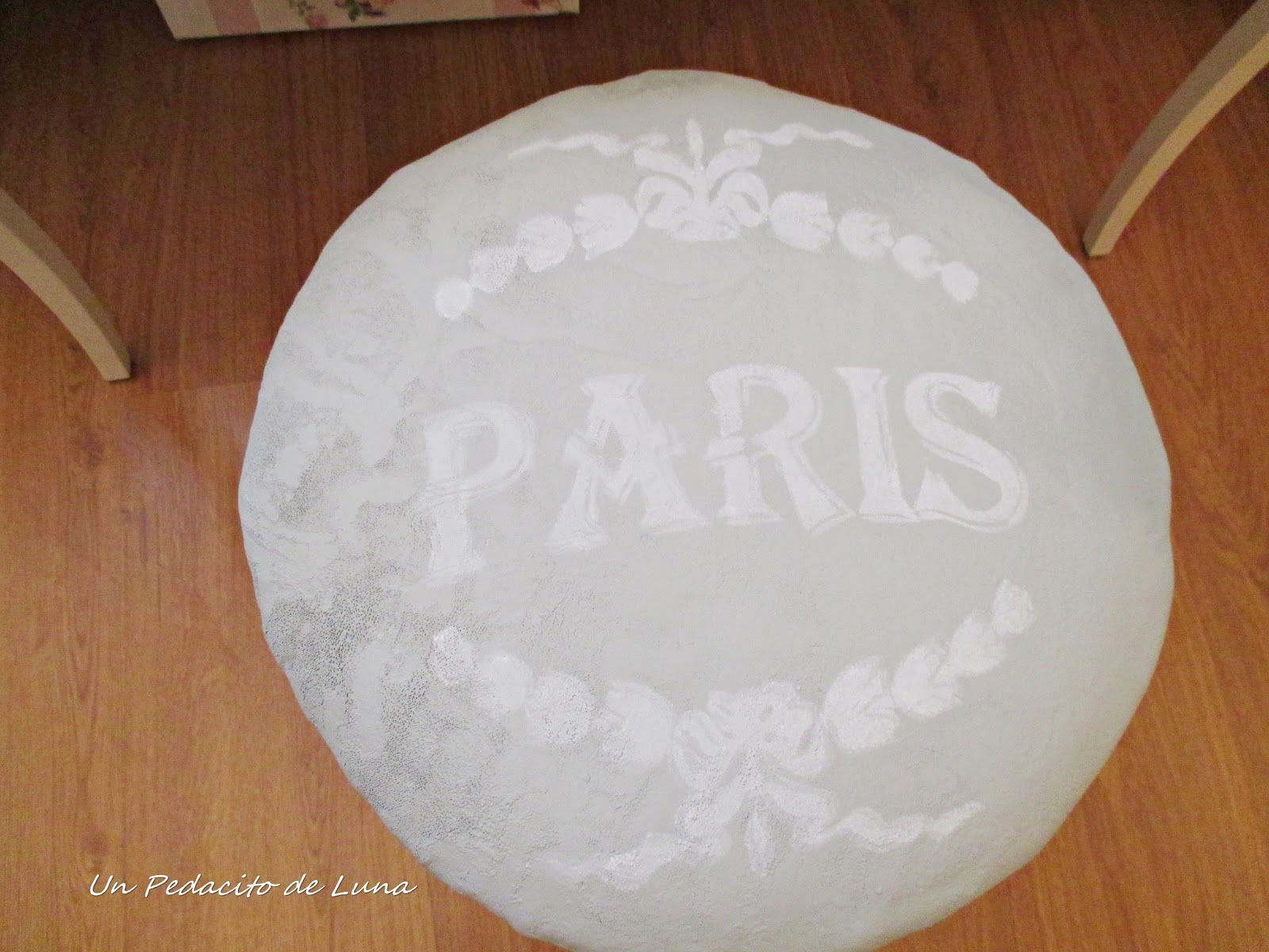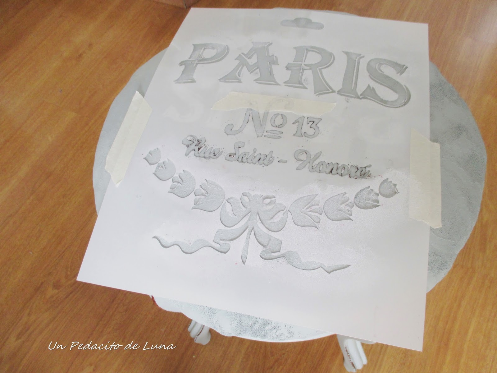 Para rematarla, le estarcí una plantilla preciosa de Lucía, de Momentos Vintage, a toquecitos muy suaves con esponja para que quedase medio desgastada.