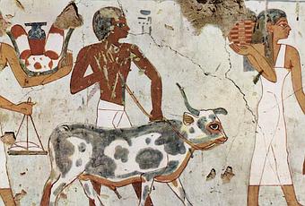 Durante el Imperio Antiguo no es posible disociar el bajorrelieve de la pintura ya que comparten los mismos temas con idénticos propósitos: representar la vida cotidiana y la naturaleza para que ambas puedan ser recreadas en la otra vida en el Aaru.En la Mastaba de Ti (dinastía V), han el hombre con una buardo, o la escena de un esclavo, cruzando un vado, que lleva sobre sus hombros un ternero, y como evidencia de realismo en la pintura de animales, el ternero vuelve su cabeza para llamar a su padre, que marcha detrás de él y de los demás.
