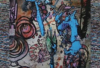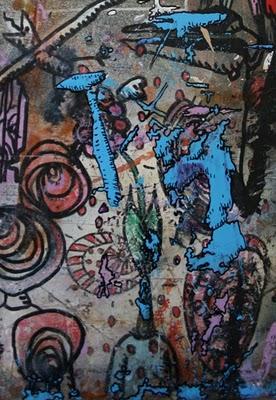 La imagen de hoy es un fragmento de mi mesa de trabajo en la que se han acumulado capas involuntarias de pintura junto con los dibujos despreocupados de los que escribo.