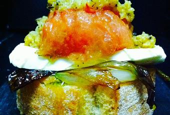 - Montaje: sobre la rebanada de pan coloca una cortada de cebolla caramelizada, encima una cortadita de queso fresco y culminando medio tomate asado con una cucharadita de su salsa.