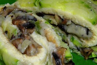 Sacamos del horno y echamos encima la crema de champiñón, enrollamos con ayuda del papel y dejamos reposar unas horas, cortamos y servimos.