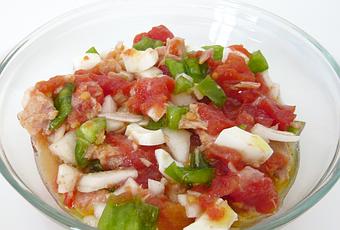 - Lavamos y pelamos los tomates. Los cortamos a daditos y los ponemos en un bol o ensaladera. Y aquí un inciso: esta ensalada queda también buenísima si gastamos tomates enteros pelados de lata. Yo en muchas ocasiones utilizo estos últimos, ya que como bien sabréis, hoy en día es difícil encontrar un tomate que sepa a tomate, y no a plasticucho o a cartón-pluma (en el mejor de los casos)...