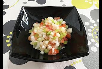 Hoy os traemos la receta de un plato que seguro que conocéis: la pipirrana. Es típico de Andalucía, sobretodo de Jaén, y se trata de una ensalada ligera de verduras. Normalmente se suele acompañar con atún en conserva, huevo cocido... pero nosotros hemos optado por hacer la versión más sencilla, apta también para vegetarianos y veganos.Ingredientes para 2 personas:- 1/2 cebolla- 1 pimiento verde italiano- 1/2 pepino- 2 tomates pera- Aceite de oliva- Sal- Vinagre de JerezReceta:- Lava el pimiento verde, el pepino y los tomates.- Pela la cebolla y el pepino.- Corta en cuadraditos todos los ingredientes: cebolla, pimiento verde, pepino y tomates.- Mézclalos en un bol grande y aliña con un chorrito de vinagre, otro de aceite y una pizca de sal.- Remueve bien y sirve.