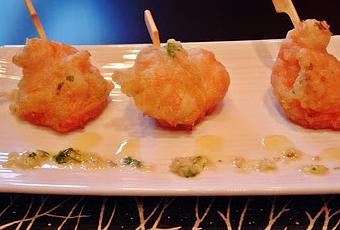 PREPARACIÓN:Lo primero es limpiar los langostinos y los ensartamos en una brocheta enfrentados, primero la parte mas ancha de uno luego la cola del otro y terminamos cerrando para que quede tipo circular.A parte picamos fino los dientes de ajo que majamos junto con el sésamo y el perejil, colocamos en un bol junto con un buen chorro de aceite y bañamos las piruletas por ambos lados, dejando macerar al menos una hora en el frigo.Pasado el tiempo preparamos la tempura para ello ponemos la harina en un bol y agregamos agua bien fría y removemos para tener una pasta, bañamos las piruletas por ambos lados y freímos en abundante aceite bien caliente. Escurrimos en un plato con papel absorvente y servimos acompañado con el majado, comer en caliente para notar el crujiente.