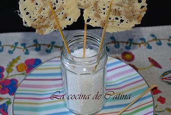 Si queréis tener un aperitivo rápido y rico, os dejo estas piruletas de queso parmesano hechas y comidas por Daniel, es como el monstruo de las galletas comiéndose las piruletas.