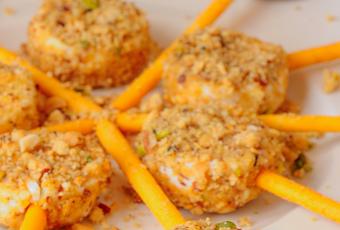 Poner los frutos secos picados en un bol. Rebozar los trozos de queso recién sacados del envoltorio (para que estén húmedos y se peguen a él los frutos secos)