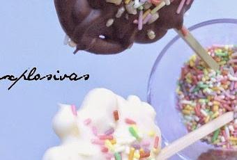 Con una manga pastelera (nosotros no teníamos así que cogimos una bolsa y le hicimos un agujerito en una esquina) ir haciendo las piruletas encima de papel de horno y colocando los palos o brochetas.