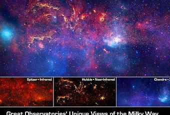 Diferentes visiones de la Vía Láctea, tomadas desde los telescopios Spitzer, Hubble y Chandra. La imagen superior es una mezcla de las 3 inferiores, tomadas en distintas longitudes de onda.Por cierto, ¡hoy tenemos Luna Azul! El término anglosajón Blue Moon se le aplica a la segunda Luna Llena que se produce en un mismo mes. El 2 de agosto tuvimos la primera Luna Llena del mes y ahora tenemos la segunda.