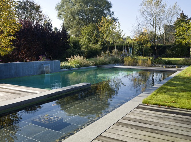 Una tendencia muy europea es construir piscinas naturales, esto es, con equilibrio natural de su ecologia, sin agregados de quimicos a sus aguas. lo que les confiere un aspecto de laguna.