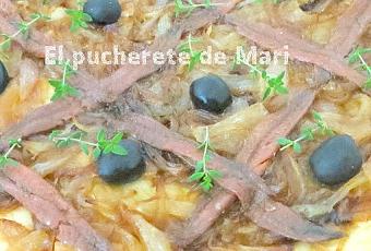 Precalienta el horno a 210º. Esparce la mezcla de cebolla formando una capa uniforme. Escurre de aceite los filetes de anchoa y colócalos sobre la masa formando una celosía. Decora con las aceitunas negras y hornea durante 15 minutos.