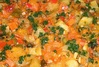 Ingredientes:3 patatas medianas1 pimiento rojo1 pimiento verde1 calabacín1 berenjena1 zanahoria1 cebolla4 dientes de ajo1 trozo de calabaza (si no tienes la omites)1 lata de tomate de medio kilo de tomate al natural troceadoSalPimienta negra molidaPimienta de cayena, pimentón picante (opcional)1 pastilla de caldo de polloAceite de olivaPerejil fresco picadoPreparación:En una sartén con aceite e oliva, echamos los ajos pelados y picaditos cuando empiecen a tomar color añadimos la cebolla picadita, meneamos, mientras limpiamos, lavamos y picamos en daditos los pimientos, pelamos las patatas y la zanahoria, lavamos y hacemos lo mismo, añadimos todo a la sartén. meneamos bien y dejamos pochar unos minutos. Mientras lavaremos la berenjena y el calabacin y con su piel las hacemos daditos. Cuando la verdura este medio pocha, añadimos la berenjena y el calabacín y hacemos lo mismo. mezclamos bien, salpimentamos un poco y dejamos pochar unos minutos mas. (todo estos pasos a fuego medio y con la sartén tapada, para la verdura se poche mas rápido y tenga mas sabor con su jugo)Cuando veamos la verdura esta casi blanda, añadiremos la calabaza y la lata de tomate, espolvoreamos con la pastilla de caldo y la mitad del perejil que hayamos picado (si queremos que tenga un toque picante alguno de los picantes que indique en ingredientes), mezclamos bien y dejamos que se termine de pochar con el jugo que tiene el tomate.Debemos menear muy a menudo para evitar se nos pegue, una vez se haya evaporado todo el juego que pueda soltar y la verdura esta blanda, rectificamos de sal y pimienta, retiramos del fuego, y espolvoreamos con el resto del perejil picado y listo el pisto para comer.Consejos: