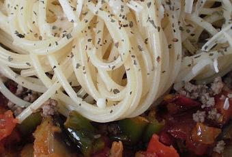 ¿Qué hice? Un PISTO MALAGUEÑO, con carne picada y espaghettis…bien completito ¿no creen?