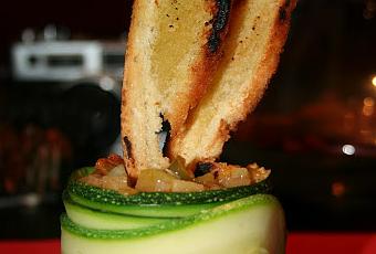 Rellenamos el molde en el que previamente hemos puesto las tiras del calabacín, con el pisto. Retiramos el molde con cuidado y ponemos unas rebanadas de pan fino “clavadas” en el pisto.