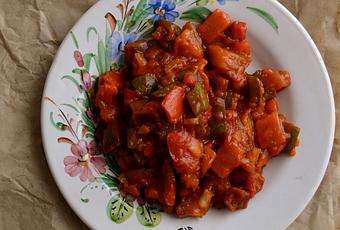 2 Pimientos rojos.2 Pimientos verdes.2 Berenjenas grandes.500 gr. de tomate frito casero (o en su defecto uno de bote de excelente calidad)1 Cucharadita de pimentón dulce.Aceite de oliva.Sal.