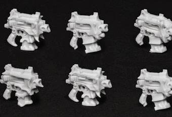 Por 7,50 euros tenemos un set de 10 pistolas bolter(Que ellos llaman simplemente "Chaos Pistols"),de 5 modelos diferentes.Son de resina,con empuñadura y sin mano.Se pueden encargar en este link.