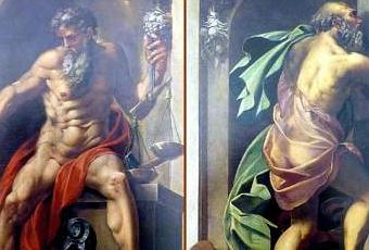 Pitágoras aparece muy a menudo como creador de la música. Los martillos crean el sonido mientras que la balanza y el compás ponen medida para hacerlo armonioso. Euclides como padre de la geometría y de las proporciones aritméticas completa con su compás el potente conjunto. El dinamismo de los personajes es ya plenamente manierista.