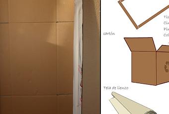 Procedimiento:1. Monta la estructura.Los listones deben ser consistentes (unos 5cm. de canto) para que la estructura quede firme.En este caso, cortamos cartón a la medida deseada y pegamos los listones entre ellos y sobre los bordes del cartón. De esta forma el cartón nos da consistencia y rigidez.2. Fija la tela del lienzo.Lo que hemos hecho ha sido disponer la tela sobre el cartón. En este caso, debido a la dimensión de la pizarra y por el miedo de que no quedase bien tensada la tela, se ha pegado la tela directamente al cartón (eso sí, cuidado en este caso con dejar burbujas, irregularidades..).Después, por la parte trasera, se puede fijar la tela a los listones con grapas además de pegamento.Si no queréis complicaros, podéis comprar un bastidor de tela ya montado (podéis adquirirlo en cualquier tienda de bellas artes).3. Aplica la imprimación a la tela.Para que se pueda escribir sobre ella, es tan fácil como mezclar la pintura acrílica que elijamos con un par de cucharillas de yeso o, en su defecto, polvo de tiza. La consistencia de la pintura acrílica con la mezcla de yeso o tiza debe ser fluida, por lo que no os paséis agregando yeso. Para conseguir un color “pizarra” aproximado, mezclar azules, blancos y negros. Aunque podéis pintar la pizarra con colores divertidos y chillones. 4. Decoración al gusto.Una vez pintada toda la pizarra, podemos recrear un marco utilizando otro tono de color acrílico. En el caso que os presentamos se pintó un marco de aspecto metálico con pintura acrílica de efecto metálico “Dazzling”. El tono elegido fue de cobre.Disponer cinta de carrocero para que las líneas del marco os salgan rectas.