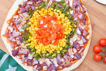 Por otro lado mientras tenemos la masa a punto, corta todas las verduras en trozos medios, los cherrys es suficiente cortarlos por la mitad. A continuación pon una base de tomate generosa sobre la pizza bien extendida y reparte el queso rallado. Llega la hora de ser el artista de la casa decorando nuestra pizza, para ello repartir los ingredientes que ya hemos cortado previamente como podéis ver en la imágen. Empezamos con la cebolla, el pimiento verde, seguimos con el maíz, el pimiento rojo y acabamos con los tomates cherrys. Al horno! durante 20 minutos a 200ºC, este detalle de temperatura y tiempo de horneado es muy a tener en cuenta el horno que tenemos cada uno. Ya que como solemos decir, cada horno es un mundo. Cuando tu pizza esté doradita, con burbujitas en los bordes y crujiente será el momento de sacarla. Si nos pasamos con el horneado a nuestras verduras se le apagará el color un poco, a nosotras nos gusta sacarla cuando aún las verduras tienen un color vibrante. Y listo!!