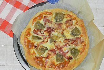 En primer lugar pondremos sobre la masa de pizza el queso mozzarella en lonchas distribuido por toda la pizza. Repartimos las lonchas de panceta sobre la mozzarella bien distribuida y hacemos lo mismo con los corazones de alcachofa en aceite.