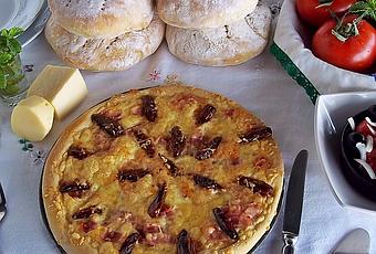* Hice la masa en la panificadora, programa amasado que dura quince minutos. Pon todos los ingredientes menos la sal. Cuando falten cinco minutos para que termine, agrégala, y comprueba que la bola se despega facilmente de las paredes. La sal y la levadura, no deben tener contacto directo, afectaría al levado de la masa.
